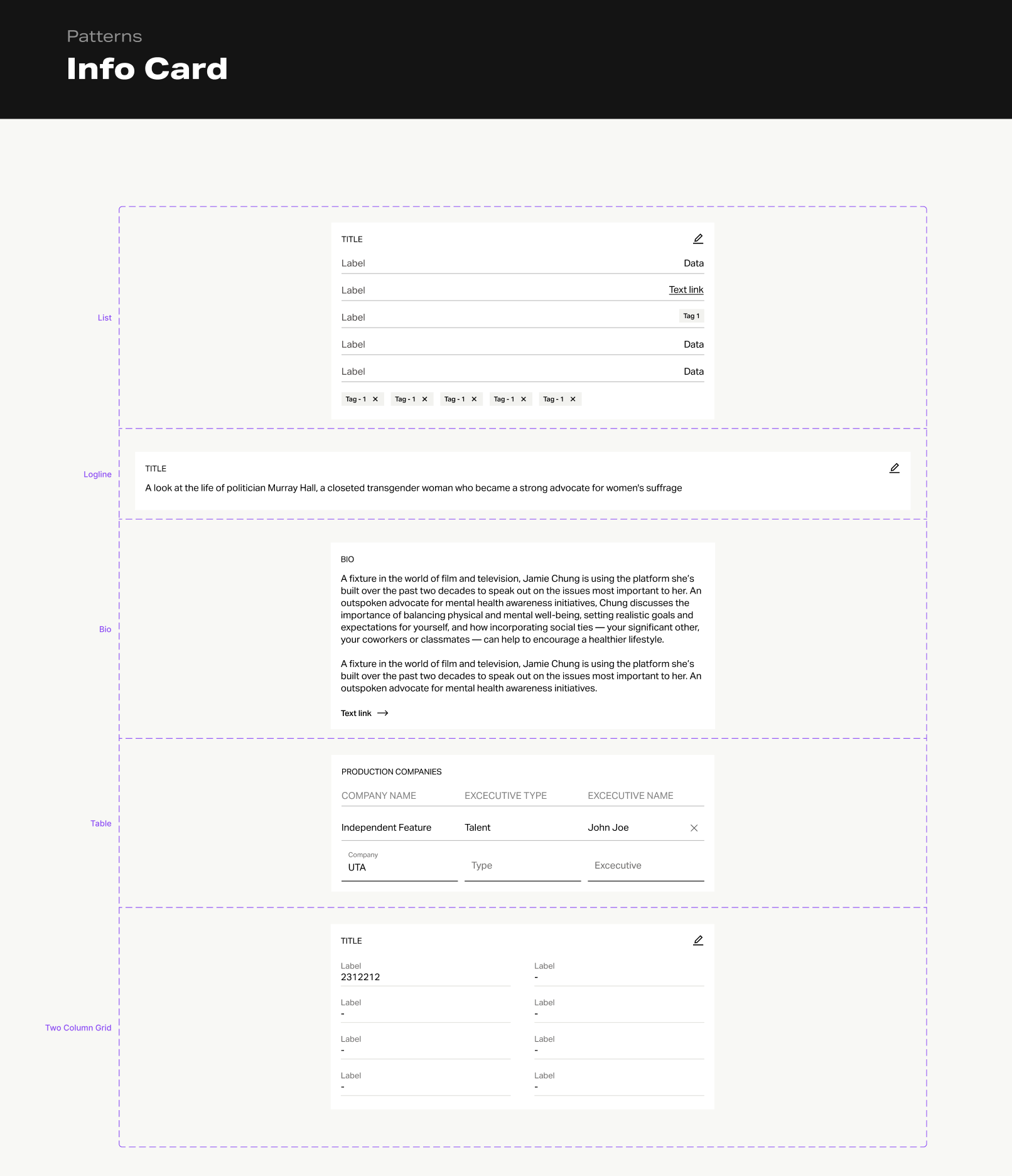 A modular system of reusable UI patterns designed to support complex, data-heavy workflows across multiple internal products.